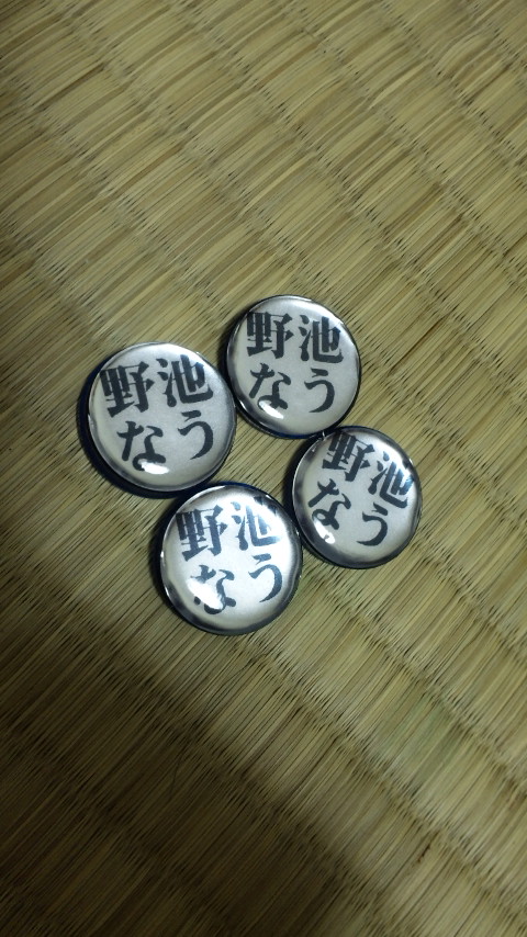 んで、この『野池なう・BITZ BUTTON』を写真の通り4つ、4名様にプレゼントします。